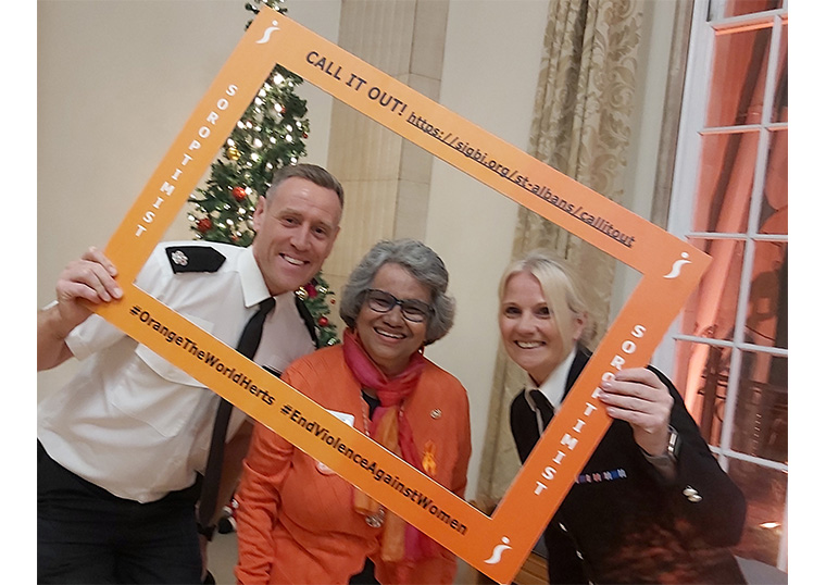 On 26th November, Annie Brewster DL attended the launch of ’16 Days of Activism’ to eradicate violence against women and girls. The event was held at County Hall, Hertford, which was lit up orange as part of the #orangetheworld campaign.